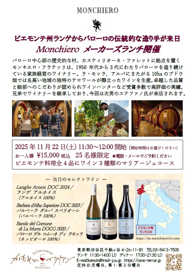 🍷Monchiero メーカーズランチのご案内 2025年11月22日(土)開催 🥂